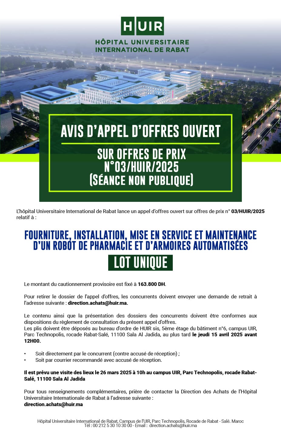 Le montant du cautionnement provisoire est fixé à 163 800 dhs. Pour retirer le dossier de l'appel d'offres, les concurrents doivent envoyer une demande de retrait à l'adresse suivante: direction.achats@huir.ma.