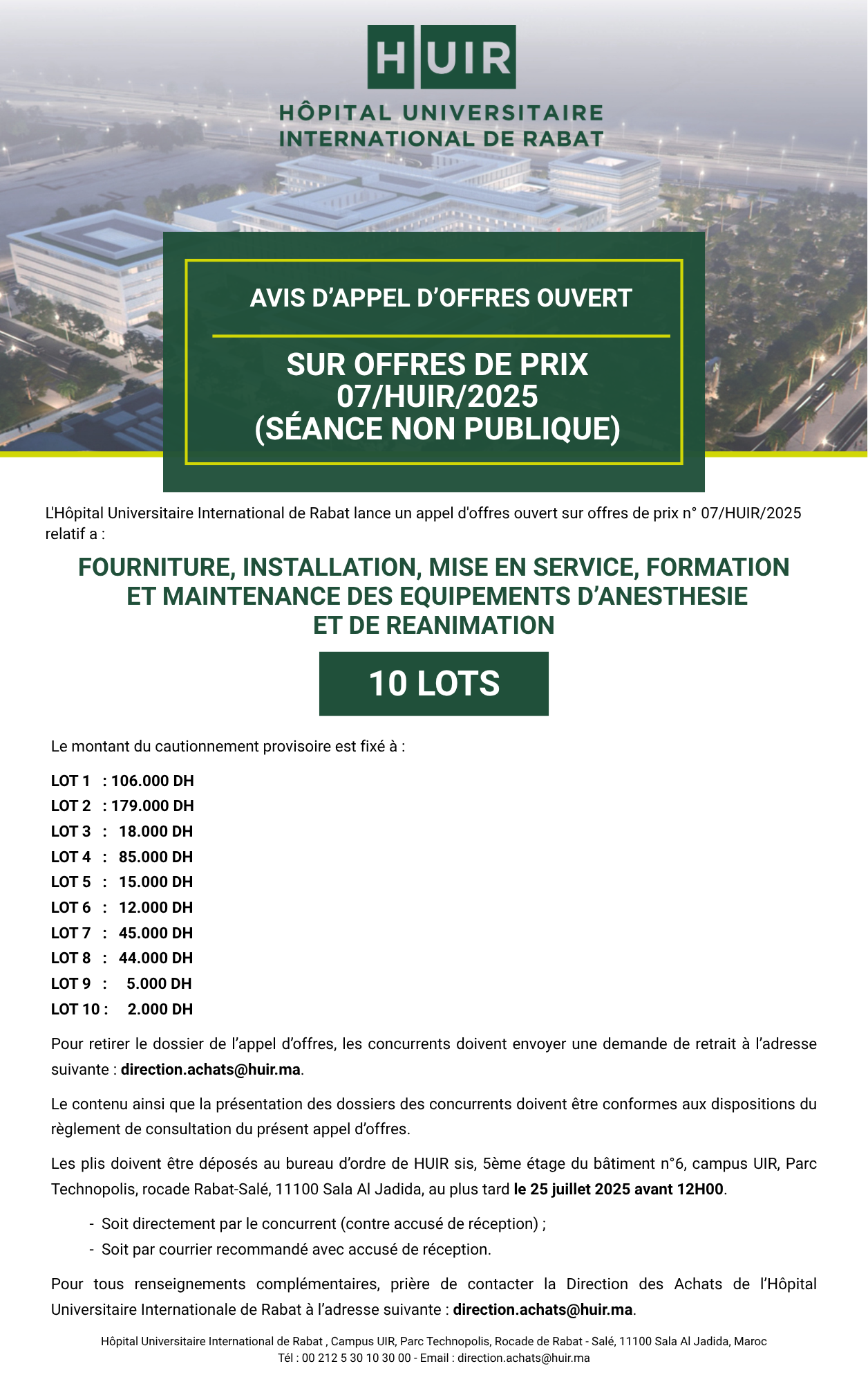 Les plis sont à déposer au bureau d'ordre de l'H UIR sis, au 5ième étage du bâtiment n°6, campus de l'UIR, Parc Technopolis, 11 11000 Sala Al Jadida, au plus tard** le 25 juillet 2025 avant 12H00.**